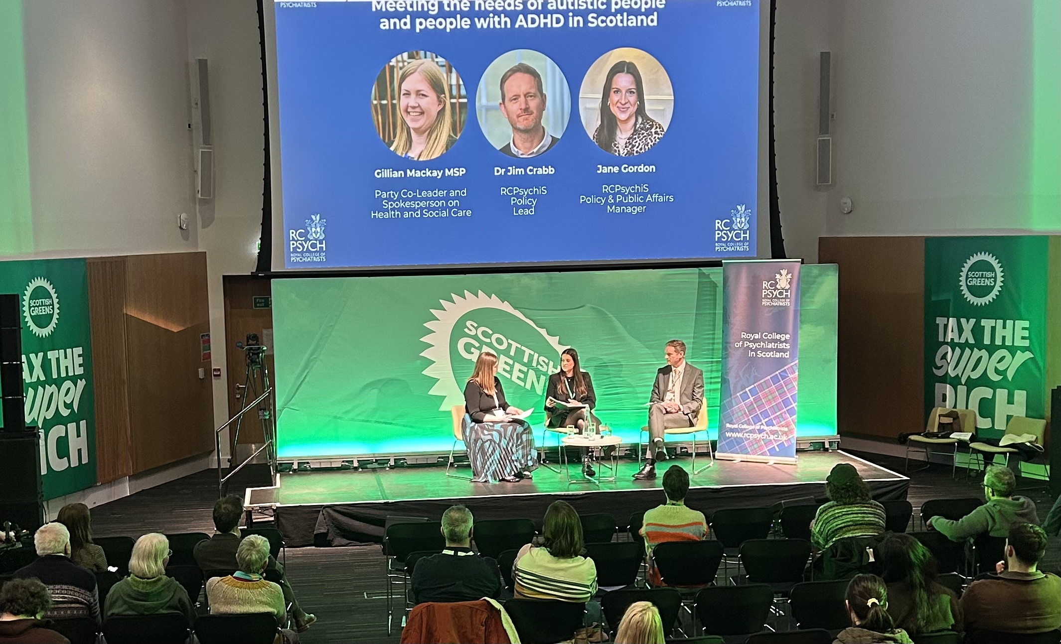 - We also attended the Scottish Greens Spring Conference, which took place at the University of Strathclyde Technology and Innovation Centre on 21st February. Jane Gordon, Policy and Public Affairs Manager, Chaired a session: ‘Meeting the needs of autistic people and people with ADHD in Scotland’ where RCPsychiS Policy Lead, Dr Jim Crabb, and Scottish Greens Co-Leader and Spokesperson for Health and Social Care, Gillian Mackay MSP were interviewed before moving to audience Q+A.